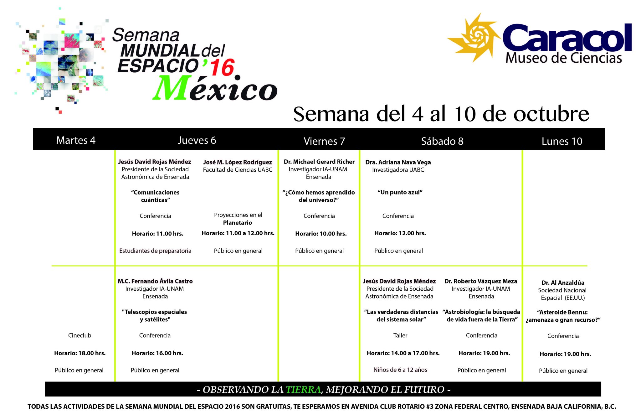 Ensenada, Baja California. 7 de octubre de 2016 (Agencia Informativa Conacyt).- Con la participación de la Sociedad Nacional Espacial de Estados Unidos (NSS, por sus siglas en inglés) y la Sociedad Astronómica de Ensenada, Caracol, Museo de Ciencias y Acuario se sumó a la Semana Mundial del Espacio con un programa de actividades gratuitas que se celebran del 6 al 10 de octubre.